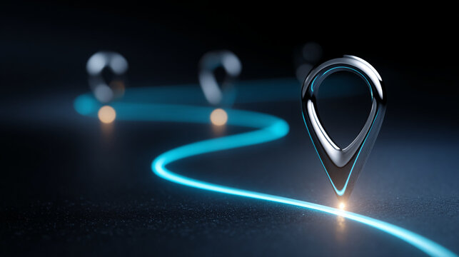 Metallic location pin on glowing blue path, symbolizes journey, navigation, or progress, showcasing route planning or technological advancement