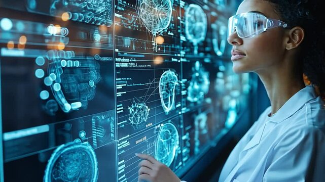 The Future is Now: A determined female scientist gazes intently at a massive interactive screen filled with intricate digital data and visualizations.