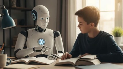Advanced humanoid artificial intelligence robot tutor assists focused young student with reading assignments and homework studying at a brightly lit indoor wooden desk environment
