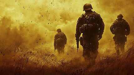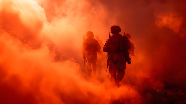Soldiers advance through thick orange smoke under dramatic lighting.