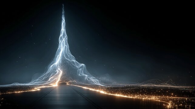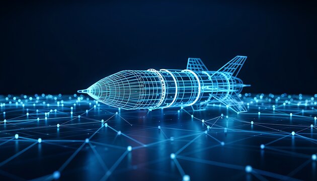 Digital blueprint of a high tech missile with glowing blue outlines on a dark network floor representing advanced weapon systems and military research