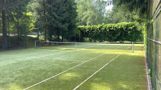 A tennis court in a park surrounded by lush greenery on a sunny morning. Tennis court with a grass surface for training and playing big tennis. Sports playgrounds.