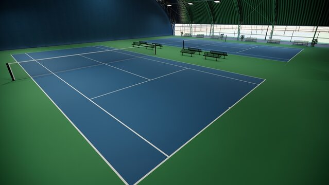 corner view of indoor tennis court  with blue and green surface, equipped with lights and lined with spectator benches
