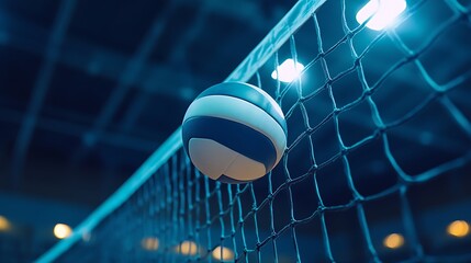 A volleyball floats dramatically above a smoky indoor court, illuminated by bright stadium lights, ready for an intense game
