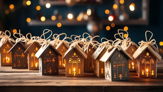 A whimsical Advent calendar with little gift boxes hanging on a wall, waiting to be opened as part of a Christmas countdown