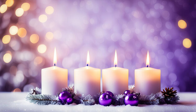 Abstract Advent - Four Purple Candles With Soft Blurry Lights And Glittering On Flames