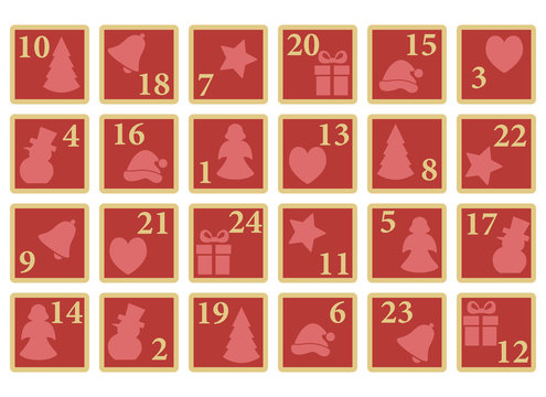 Christmas advent calendar. Cute cozy festive december countdown with gifts and sweets. Perfect for Christmas cards, posters, wrapping paper, and seasonal design projects. Flat vector illustration