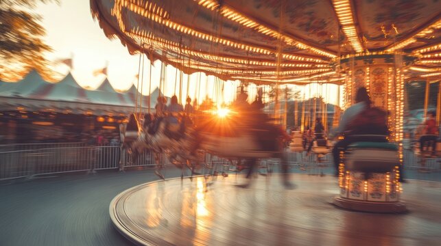 Silhouetted people riding illuminated carousel swing at sunset. Motion blur effect of free movement. Retro nostalgic carnival and amusement park concept.