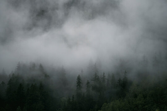 AI Generated. AI Generative. Photo realistic illustration of mountains forest fog morning mystic. Graphic Art