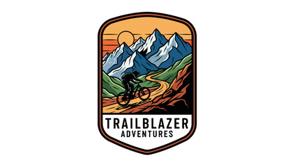 Vintage outdoor adventure badge featuring a mountain biker on a winding trail with mountains and a sunset, for Trailblazer Adventures.