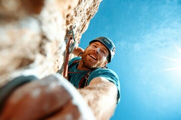 Geared rock climber embracing outdoor adventure
