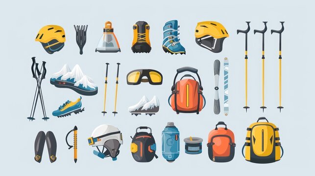 Climbing Gear Vector Set Featuring Rope, Harness, Shoes, and Climbing Wall