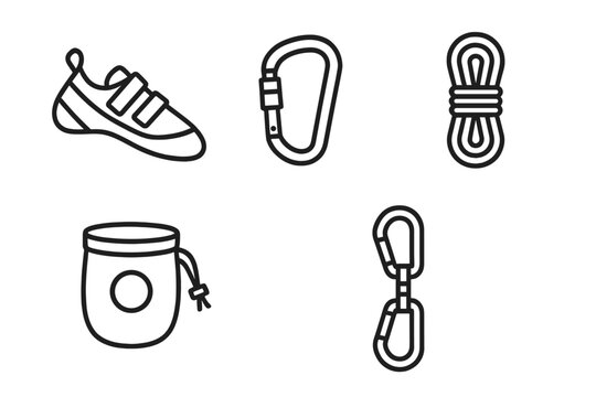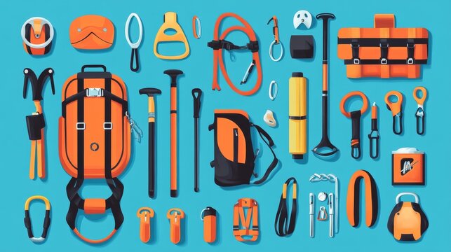 mountain climbing gear compilation, adventure equipment designs, sport safety tools, modern vector illustration style, vibrant color palette, minimalist equipment drawings, technical outdoor elements