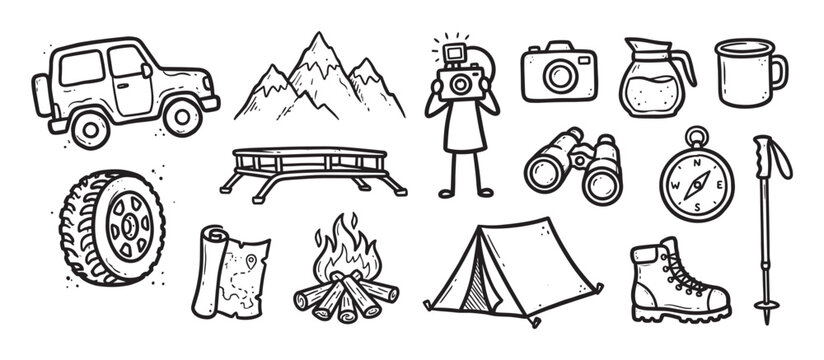 Hand-drawn collection of outdoor adventure icons featuring a car, tent, mountains, campfire, and hiking gear in a charming black and white doodle illustration style