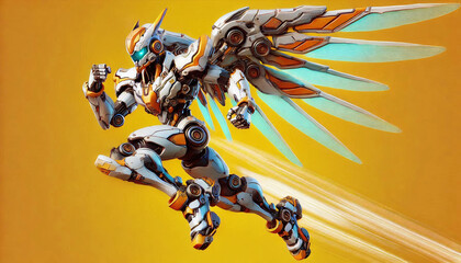 A robo animated character with wings and armor in a dynamic pose against a yellow backdrop. Generative AI.