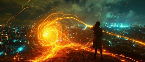 Urban Nightscape with Light Trails and Skyline View