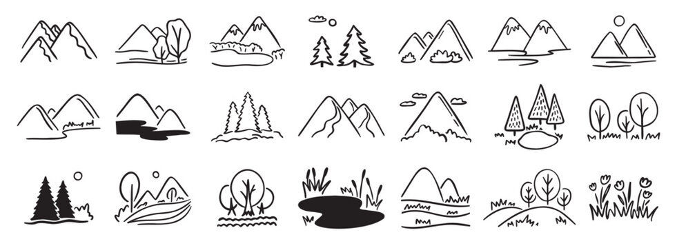 Mountains landscapes nature with pine forest, river, mount and hills doodle hand drawn icon set. Outline drawing rocky horizon environment line clipart symbol collection.