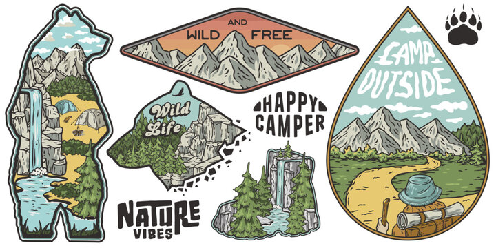 Set of outdoor-themed stickers featuring mountains, nature, and camping elements for adventure lovers and to decorate gear with wild life and travel vibes