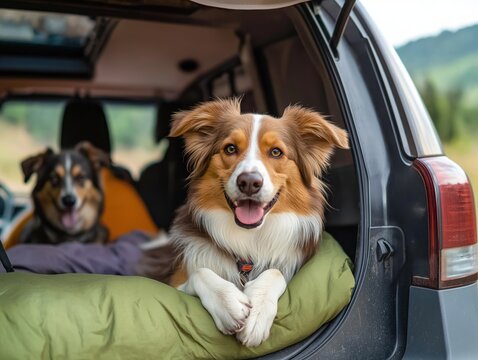 Two dogs enjoy car trip. Happy dogs in car trunk. Pets relaxing. Family vacation. Camping adventure in car. Outdoor fun. Pet owners enjoy pets in nature.