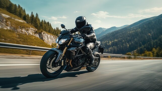 motorbike on the road riding. having fun driving the empty road on a motorcycle tour journey. copyspace for your individual text. Created with Generative AI technology.