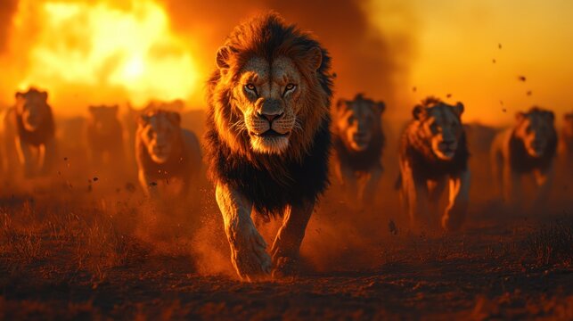 A pack of happy dogs dashes through deep snow in a forest, their leashes pulled tight as they explore the winter wonderland together on a lively afternoon