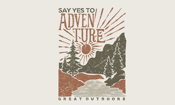 Say yes to adventure. Abstract art.  Hill trekking. Mountain adventure vintage print design for t shirt. Wild lake vector artwork design. Explore more. Colorado national park artwork.