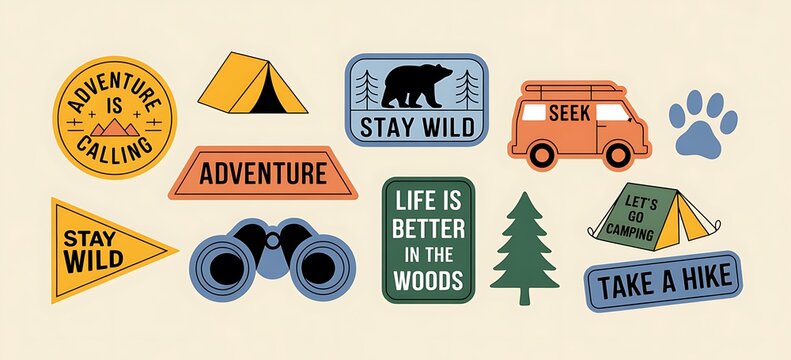 Vintage style camping adventure patches and stickers collection for outdoor enthusiasts