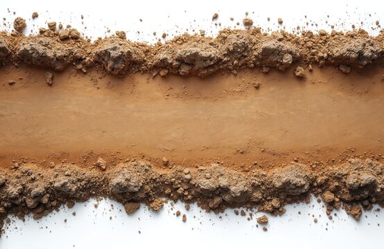 Illustration features top view of dirt road isolated on white background. A rural path with rough soil texture and scattered stones runs through countryside landscape.