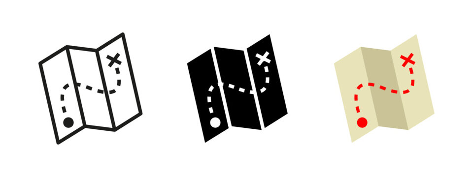 Treasure map icon. Folded map with dotted route and X mark vector illustration. Navigation and exploration symbol for travel or game design. Adventure journey pictogram with marked destination.