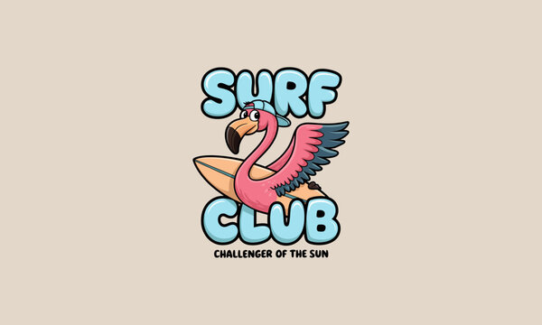 Flamingo holding a surfboard with Surf Club text design