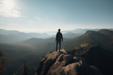 a man with backpack holding camera standing on cliff with mountains view and sunlight through cloud. Travel lifestyle, adventure and success concept