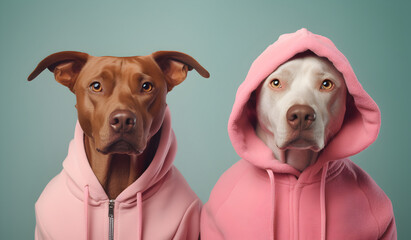 Title and Purpose of the Image: "Loving Doberman Couple in Colorful Pink Tracksuits: A Display of Canine Affection and Fashion.