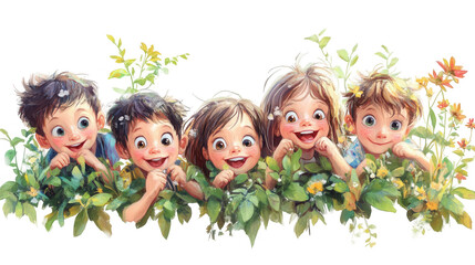 Children’s Day PNG featuring kids playing hide and seek in a jungle, perfect for use in adventurous party themes, outdoor event designs, and kids' celebrations, isolated on white