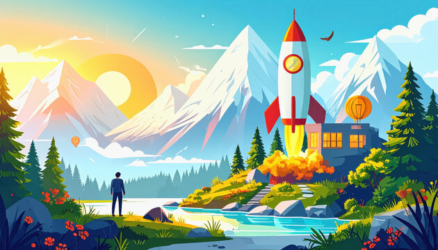 Adventurous man standing before majestic mountain landscape with copy space for text illustrations on white background