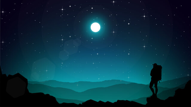 Adventurous Man Hiker standing in a cave with rocky mountains in background, sunset