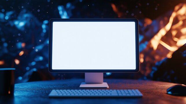 Gaming display mockup on black desk with gaming keyboard and mouse. Blue wall with ambient lights in background. Game promotion concept