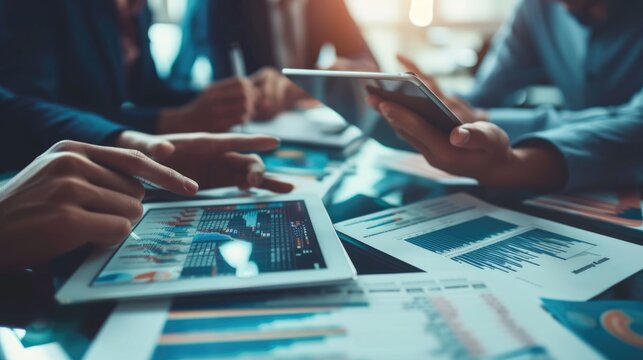 Group of professional business people working together and discussing about marketing strategy. Skilled business team planning about financial plan while looking at stock market chart at table. AIG42.