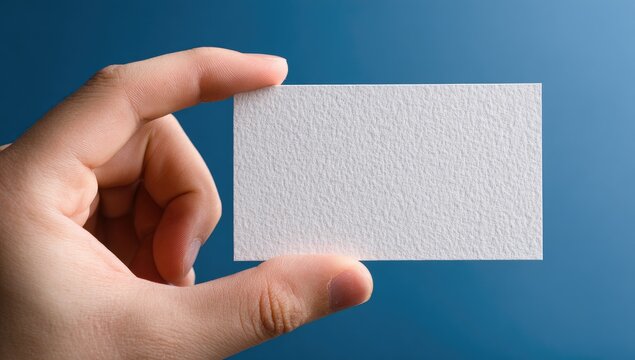 A hand holds a blank white business card against a deep blue backdrop.  The card is textured, and the hand's fingers gently grasp it