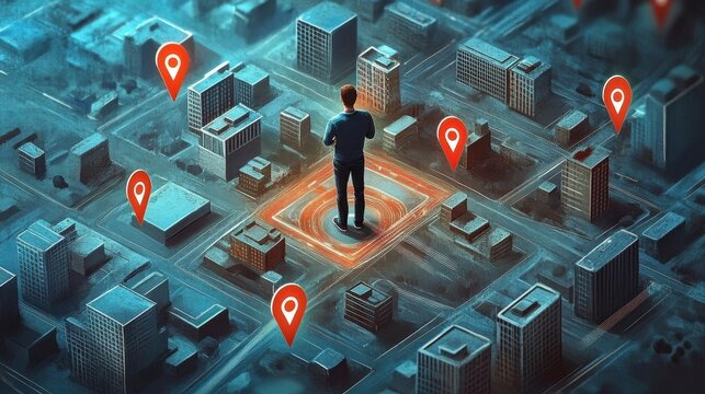 Geofencing technology. A stylized, miniature city model with a large geo pin prominently placed. The use of geofencing in urban areas for marketing, security, and logistics. Generative AI