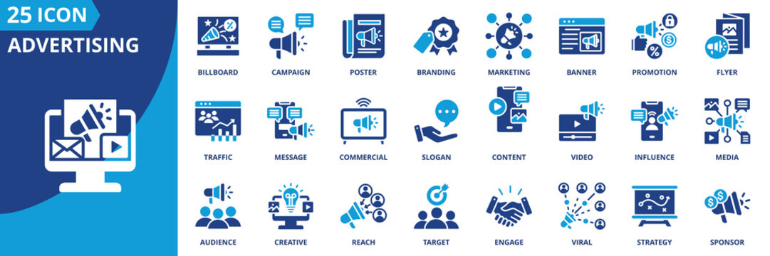 Advertising icon set collection in flat style. Icon pack contains advertising, branding, promotion, marketing, campaign, banner, poster, flyer, billboard, commercial