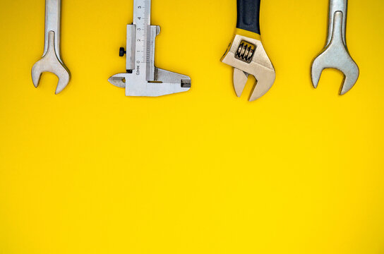 Set of tool for plumbers on yellow background with space for advertising