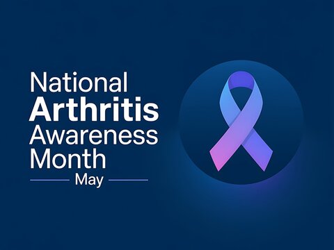 A poignant purple and blue ribbon symbolizes National Arthritis Awareness Month in May, a quiet tribute on a deep blue background.