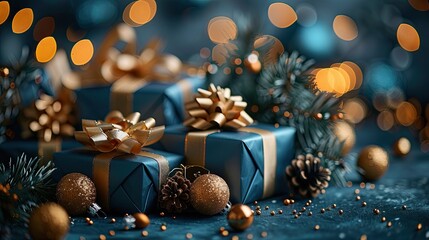 Gift boxes elegantly wrapped against a deep blue backdrop, perfect for festive promotions, greeting cards, and marketing materials celebrating the season.