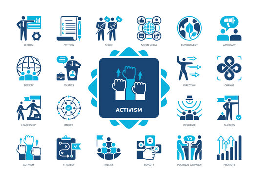 Flat vector icons of policy and systemic change: policy document icon, law reform symbol, government petition board, social policy chart, impact legislation scroll, political advocacy badge,