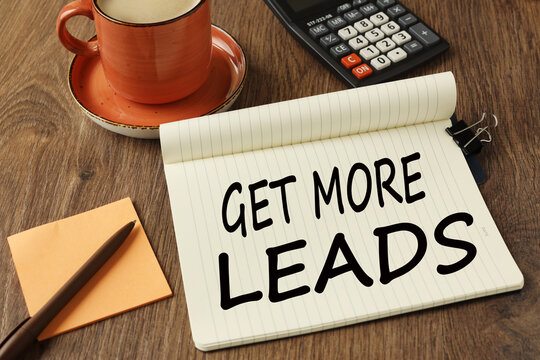 Get More Leads, text on a black background, on a black folder, on white paper, near bright stickers