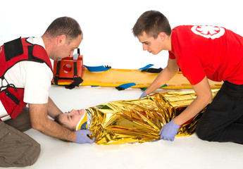 The medical team is practicing saving lives with models and using machines. defibrillator To save lives