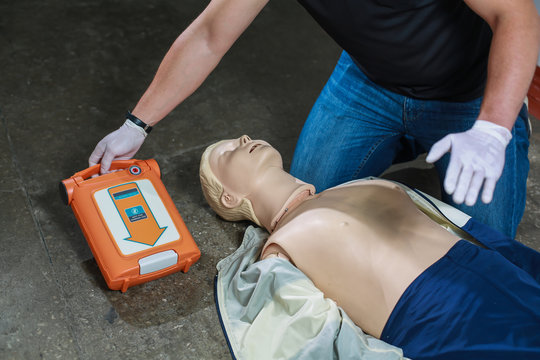Instructor teaching first aid cardiopulmonary resuscitation course and use of automated external defibrillator on voluntary CPR workshop.