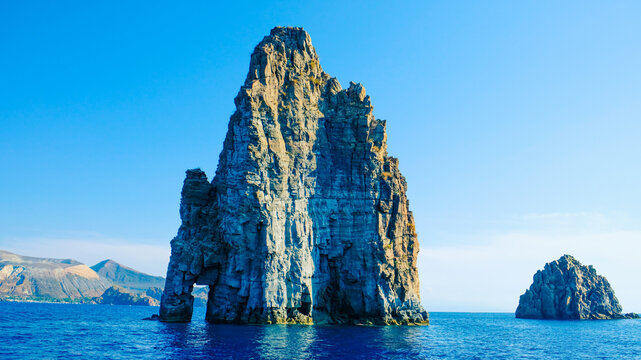 Aeolian Island, Italy. Volcanic rock in the Tyrrhenian Sea near Sicily. Hand drawn linear doodle rough sketch. Black and white silhouette.