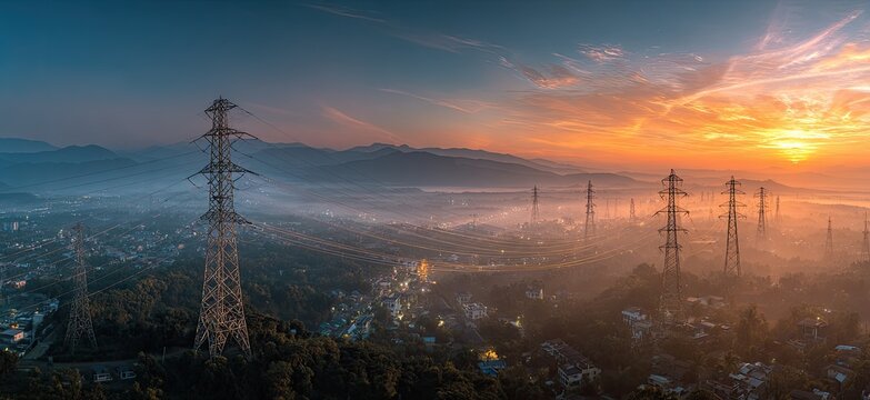 Panoramic sunrise over a misty valley, showcasing numerous tall electricity pylons against a backdrop of mountains and a cityscape