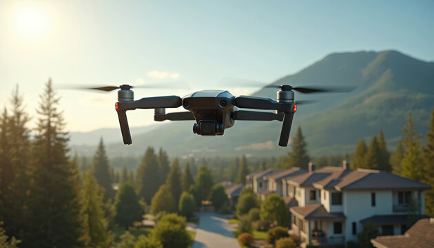 Drone flies over houses near trees. Quadcopter hovers in air over residential area at sunny day. Drone delivers cargo. Modern air delivery service in urban area. Mountain background.